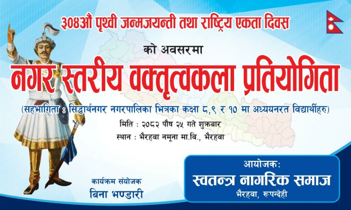 ३०४ औँ पृथ्वी जयन्तीको अवसरमा नगरस्तरीय अन्तर विद्यालय वक्तृत्वकला प्रतियोगिता हुने